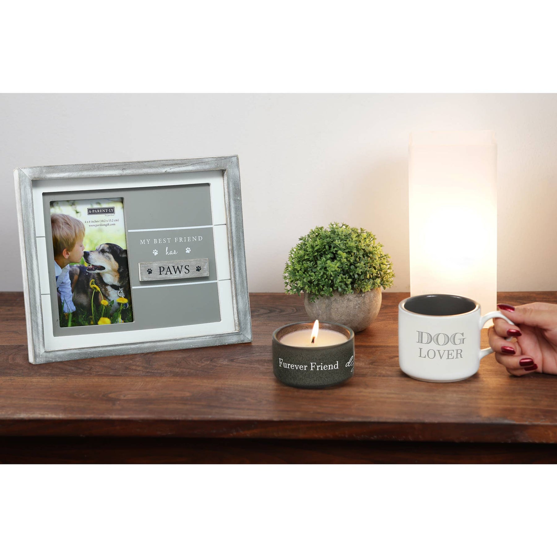 This vertical frame measures 9.75" long x 8.25" tall holding 4" x 6" adored photo memory frame edges are rounded. Packaged safely in a die-cut box. Weathered gray wood-washed edging with bead board backing. Made from sturdy MDF and real wood construct with a glass photo cover. "My Best Friend Has Paws" white and gray decal sentiment and paw pattern is printed on the layered frame. The backing has four metal tabs for photo replacement. Easel back with metal hinge and supportive ribbon for tabletop display. Dust with a damp or dry cloth as needed. Bring a smile to your favorite pet parents face. Great for dog moms, dog dads, cat moms and cat dads. Rescue animal lovers will be pleased to treasure their favorite memory with their four legged friend. We designed and created this frame to blend in with any of your home's current decor with a refined neutral, aesthetically pleasing look paired with humor and relatable sentiment.
