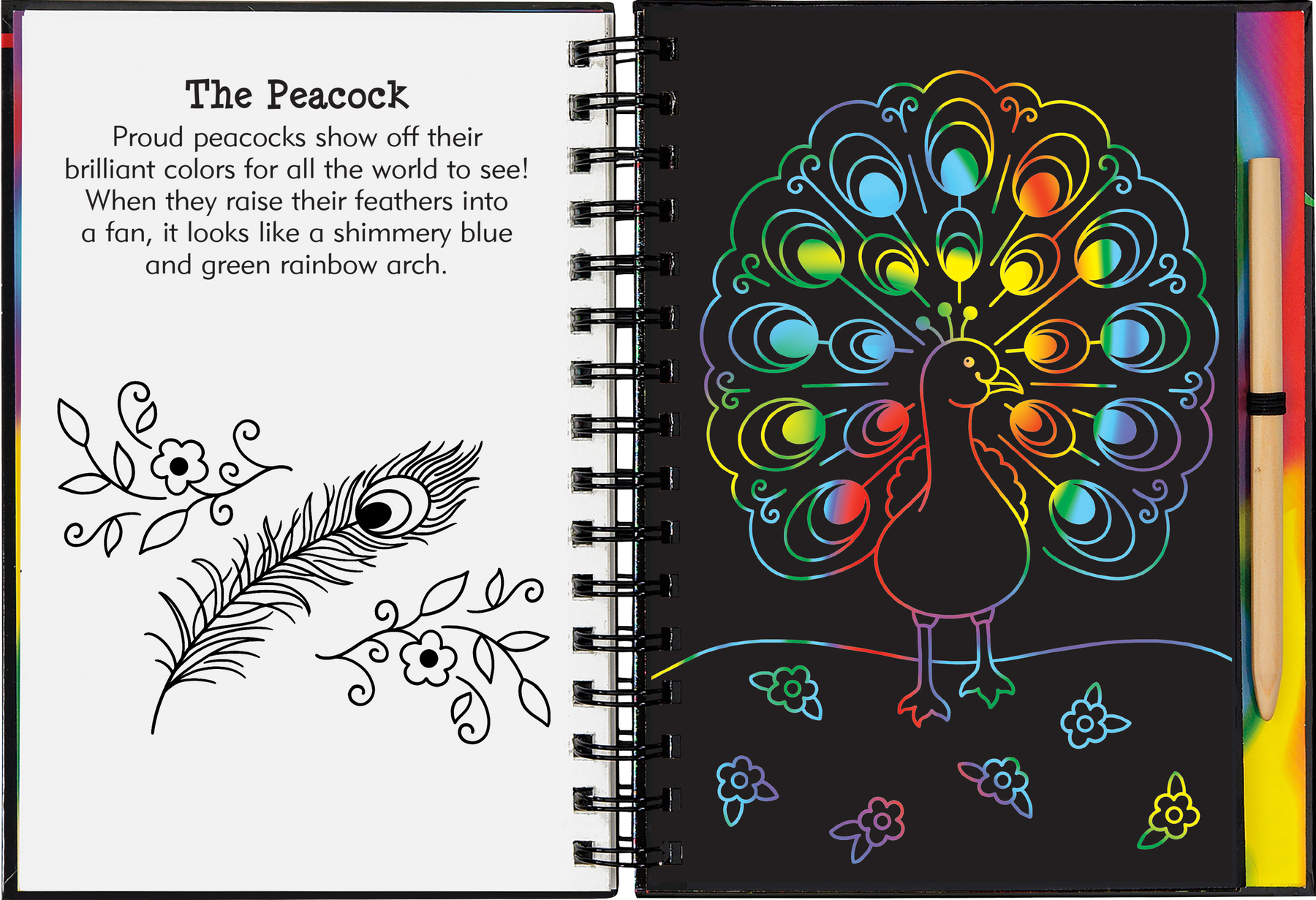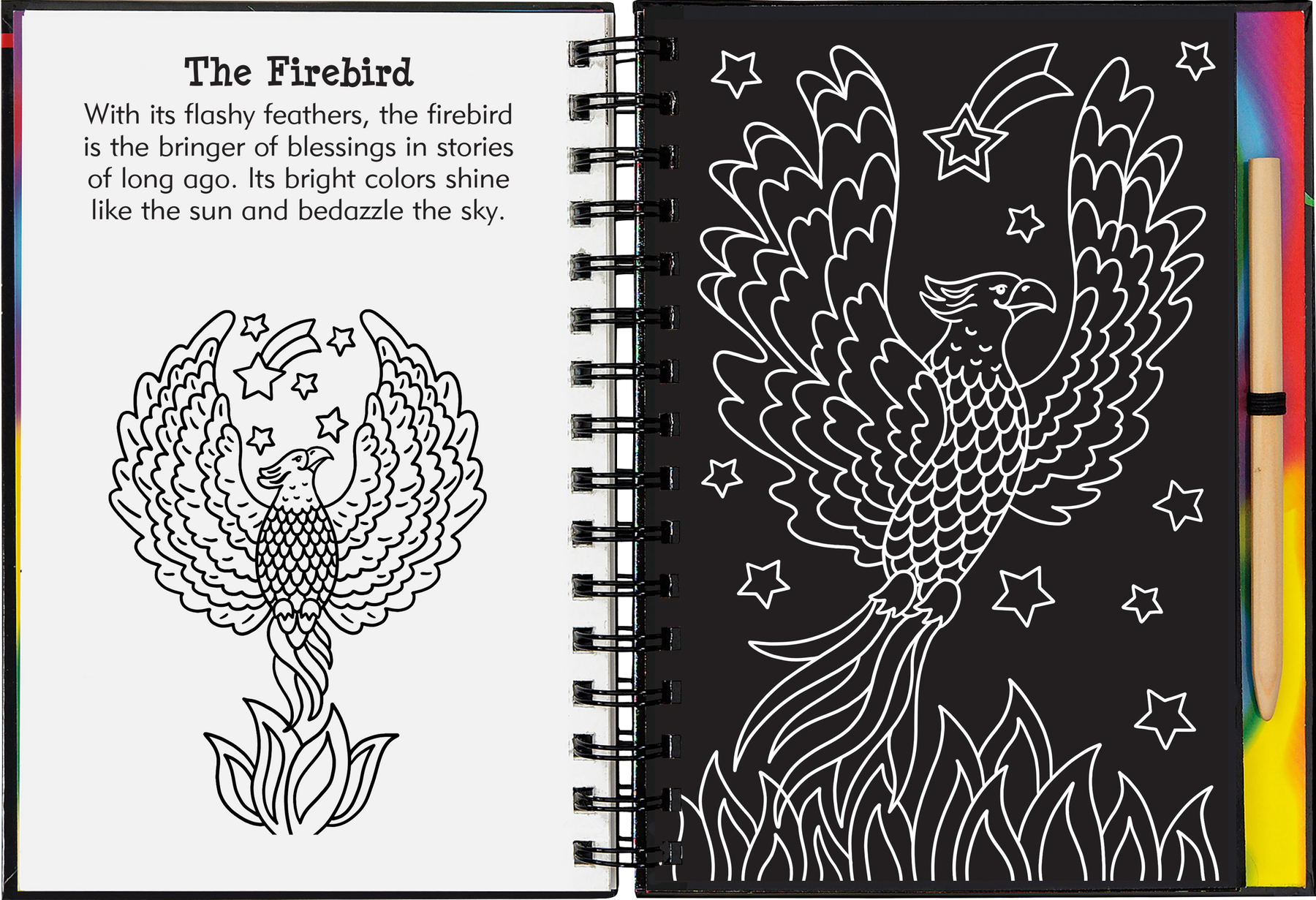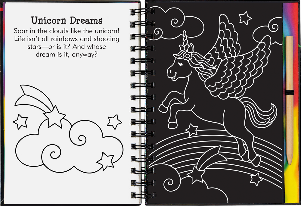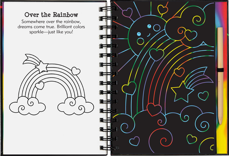 Calling all magical artists! Scratch and Sketch your way through all the places and faces of rainbow magic! From rainbows in the sky to kaleidoscopic colors that shine in the fish of the sea, in tropical birds, in candy, kites, and more! Rainbows beam good fortune and hope, just like magic! This is a Trace-Along Scratch and Sketch ! Use the wooden stylus included to trace the white outlines on the black-coated pages and reveal the glittery foil colors beneath! Makes a fun way for young children (5 and up) to build confidence in their creativity. They can also use the extra sketch pages in the back to draw their own pictures. Art activity book contains 20 black-coated scratch-off pages, 20 illustrated pages with descriptive text, and 20 extra pages for independent drawing and sketching. The wooden stylus is shrink-wrapped with the book. Suggested ages: 5 and up. Sturdy wire-o hardcover binding.