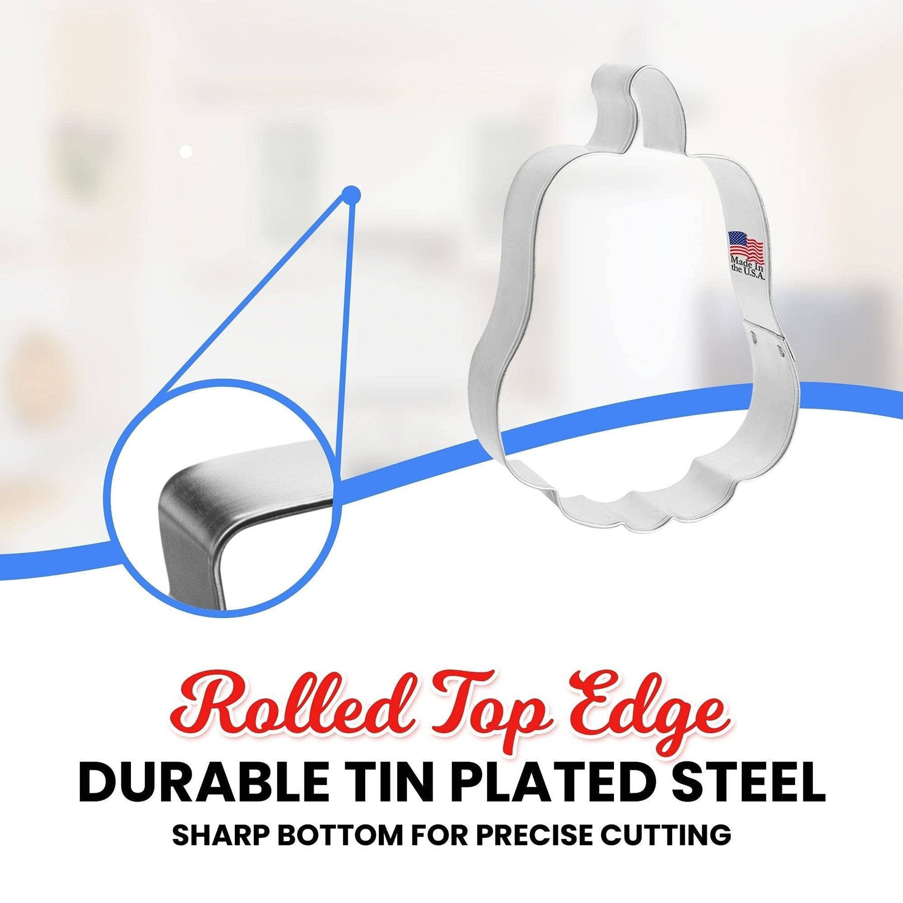 Tall pumpkin cookie cutter, made of sturdy tin, size: 3.75 in up and down by 2.5 in wide. Depth 7/8 in, made in the USA.