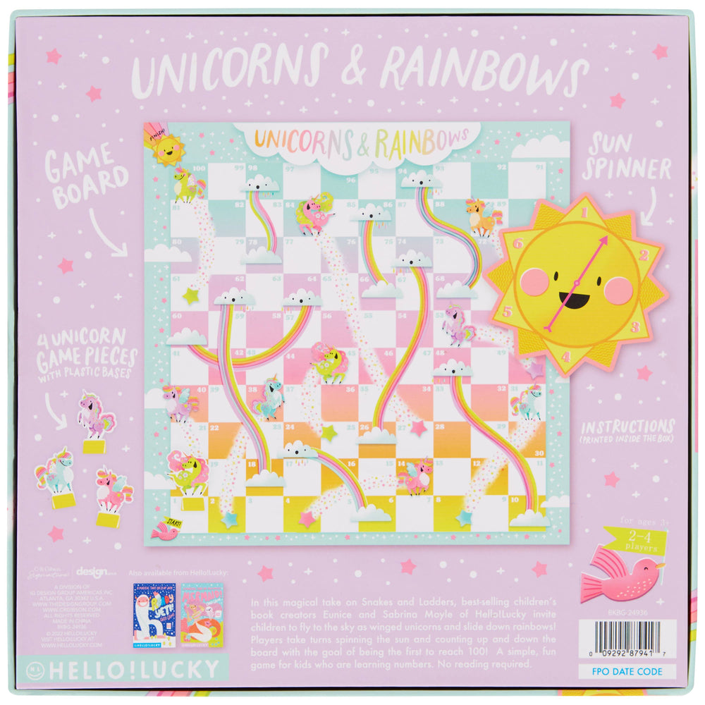 A magical take on a popular board game HELLO!LUCKY'S UNICORNS & RAINBOWS is perfect for ages 3+. Vibrant and fun unicorns try to reach the bright Sun at the end of the board game by sliding across rainbows and avoiding rainy clouds. Includes 4 Unicorn Game Pawns, Sun-shaped spinner, instruction sheet. 2-4 players.